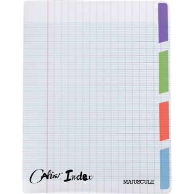 Piqûre 140 pages 4 index MAJUSCULE, format 17x22 cm, seyès, couverture polypropylène incolore