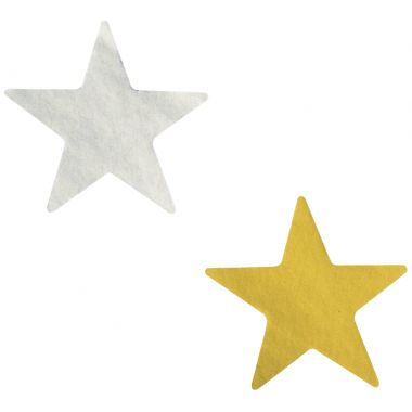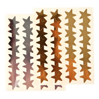 Pochette de 128 maxi gommettes étoiles métalisées or et argent. 4 planches : 2 or et 2 argent. Hauteur d'une étoile : 3,5 cm. Collage adhésif permanant