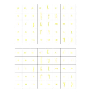 Pochette de 1600 gommettes lettres. 20 planches. 7 planches : lettres majuscules, 7 planches : lettres minuscules et 6 planches lettres cursives. Coloris : rouge, bleu, vert, jaune et noir Lettres imprimeries.