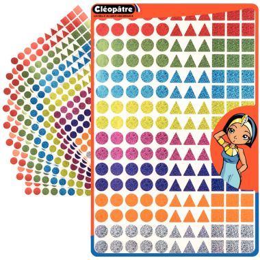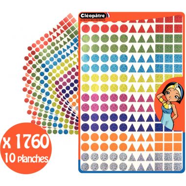 Pochette de 1760 gommettes géométriques holographiques assorties. 3 formes - 8 couleurs - 16mm.