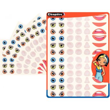 Pochette de 360 gommettes visage assorties. Adhésives, repositionnables. 10 planches : yeux, nez, oreilles et bouches.