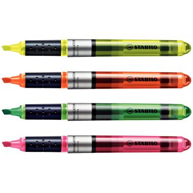 Pochette de 4 surligneurs Navigator assortis. Design effilé avec grip confort. Encre liquide à débit régulier. Ne sèche pas même ouvert. Tracé de 1 à 4mm. Coloris : jaune, orange, vert, rose.