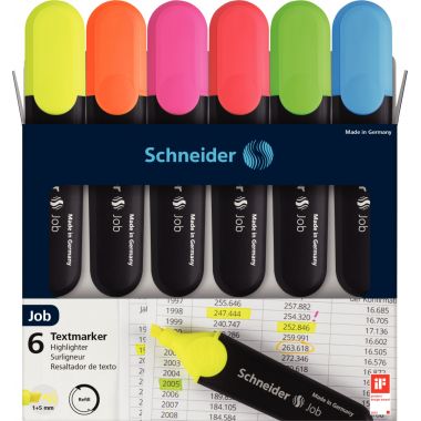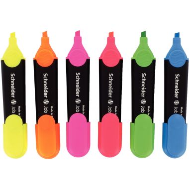 Pochette de 6 surligneurs Job assortis. Pointe biseautée pour trait d'écriture de 1 à 5mm. Encre universelle pour papier normal, photocopie et fax. Coloris jaune, orange, rose, rouge, vert et bleu.