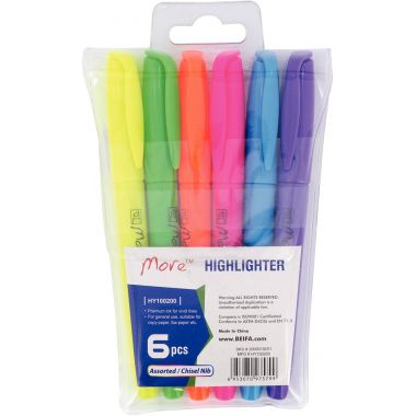 Pochette de 6 surligneurs poche assortis. Encre tampon universelle. Pointe moyenne biseautée. Coloris: Jaune - Vert - Rose - Bleu - Orange - Lilas.