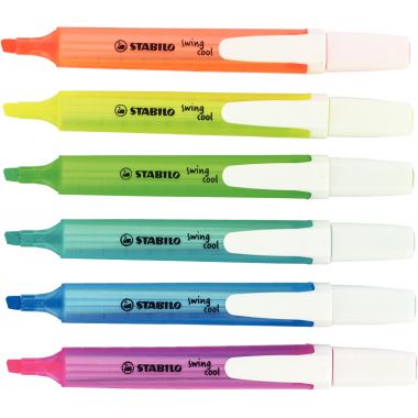 Pochette de 6 surligneurs Swing Cool assortis. Encre fluorescente universelle à base d'eau. Habillage effet "givré". Résistance intense à la lumière. Avec agrafe. Pointe biseautée: 2 largeurs de tracé de 1 à 4mm. Coloris orange, jaune, vert, bleu, lavande et rose.