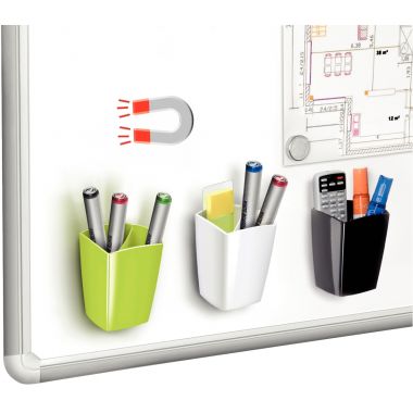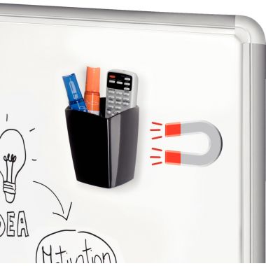 Pot à crayon mangnétique 2 compartiments vert noir. Équipé d'un aimant puissant, idéal pour les tableaux blancs magnétiques et les surfaces métalliques planes. Supporte une charge de 300g et peut contenir jusqu'à 8 feutres pour tableau blanc.