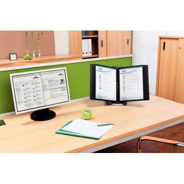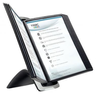 Pupitre de table SHERPA STYLE 10 pochettes. Pupitre de table fonctionnel composé d’un socle lesté très stable avec dosseret, 10 pochettes avec cadre de couleur noire, et 10 onglets d’indexation. Pour tous documents jusqu’au format A4, lecture recto/verso. Pupitre en polyamide, pochettes en polypro antireflet mat et 100% recyclables. Garantie 5 ans.