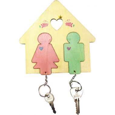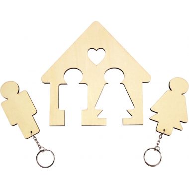Range-clés maison en bois à suspendre. En bois brut à décorer et à suspendre. Range clés original en forme de maison avec une découpe cœurs et 2 porte-clés amovibles en forme de personnages. Cadeau idéal pour la fête des mères et des pères. Avec une attache au dos pour l'accrocher. Dimensions de la maison : L.15 x H.15 x ép.0,5 cm. Dimensions d’un porte-clés : L.4,5 x H.9 cm.