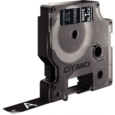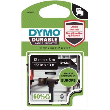 Recharge DYMO D1 12 mm x 3 m impression blanc support noir. Système D1 a mono-cassette pour modèles : 1000 / 1000+ / 2000 / 3500 / 4500 / 5500 / LP 100 / LP 200 / LP 300 / LM 100 / LM100+ / LM 150 / LM 200 / LM300 / LM 350 / LM400 / LM PC / Pocket. Ruban encreur et ruban support associés offrent une totale facilité d'utilisation du système. Support plastique. Les étiquettes imprimées s'utilisent toutes de la même façon. Elles adhèrent sur la plupart des surfaces propres et planes (papier, plastique, métal, bois, verre). Résistantes à l'eau, au pétrole et aux graisses, de même qu'à la plupart des solvants doux. Elles résistent également aux températures situées entre - 30° et + 150°C. Les rubans D1 DURABLE bénéficient d'un adhésif extra-fort. Ils résistent aux UV, températures extrêmes et à l'abrasion. Usage intérieur et extérieur.