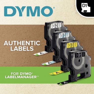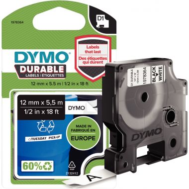 Recharge DYMO D1 12 mm x 5,5 m impression noire support blanc. Système D1 a mono-cassette pour modèles : 1000 / 1000+ / 2000 / 3500 / 4500 / 5500 / LP 100 / LP 200 / LP 300 / LM 100 / LM100+ / LM 150 / LM 200 / LM300 / LM 350 / LM400 / LM PC / Pocket. Ruban encreur et ruban support associés offrent une totale facilité d'utilisation du système. Support plastique. Les étiquettes imprimées s'utilisent toutes de la même façon. Elles adhèrent sur la plupart des surfaces propres et planes (papier, plastique, métal, bois, verre). Résistantes à l'eau, au pétrole et aux graisses, de même qu'à la plupart des solvants doux. Elles résistent également aux températures situées entre - 30° et + 150°C. Les rubans D1 DURABLE bénéficient d'un adhésif extra-fort. Ils résistent aux UV, températures extrêmes et à l'abrasion. Usage intérieur et extérieur.