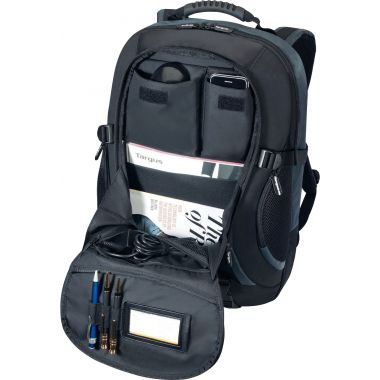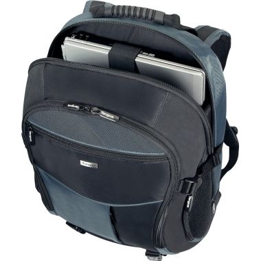 Sac a dos Atmosphère noir/bleu 18". Polyester . Grand compartiment avec espace rembourré pour PC 18 pouces. Grande poche organiseur. Coloris Noir/Bleu. Doté d'une housse imperméable que vous pouvez ranger dans une poche secrète, votre portable est protégé même quand il pleut. La poignée moulée, la ceinture, le dos rembourré et les attaches renforcées en nickel fournissent une protection optimale lors du transport de votre portable grand écran. Format extérieur : 36 x 49 x 13cm
