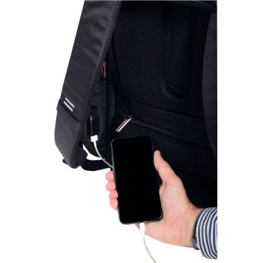 Sac à dos Exactive pour ordinateur jusqu'à 15.6'. Tissu polyester 840 deniers. Le sac à dos Exactive est léger et confortable pour transporter son ordinateur, ses accessoires et ses documents. L'accès au compartiment principal se fait par l'arrière du sac à dos pour une meilleure protection contre le vol. Une petite poche sur le devant permet de ranger quelques petits objets précieux. La seconde poche zippée, plus spacieuse, offre différents emplacements pour ranger stylos, cartes de visite, téléphone, tablette... Enfin, le compartiment principal contient 2 poches matelassées séparées pour tablette et ordinateur jusque 15,6", ainsi qu'un espace pour classer des documents. Possibilité de recharger un téléphone ou une tablette grâce au port USB intégré (câble et chargeur non fournis). Un passant au dos permet de glisser le sac à dos le long d'une poignée télescopique de valise. Dimensions extérieures : 46 x 34 x 16 cm. Dimensions intérieures : 37 x 27 x 3,5 cm. Garantie 2 ans.