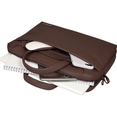 Sacoche Zurich marron 15.6 pouces. Design et tendance. en cuir synthetique. 1 grande poche pour PC et multi poches pour accessores, boudoulière amovible et sangle pour trolley. Format extérieur : 40x 33.5 x 6cm.