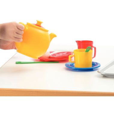 Service à café avec plateau. 18 pièces en plastique résistant : 1 plateau, 4 tasses, 4 sous-tasses, 4 cuillères, 1 sucrier avec couvercle, 1 pichet à lait et 1 cafetière avec couvercle. Dimensions de la cafetière (L x l x H): 15,5 x 8,5 x 10 cm. Dès 2 ans.