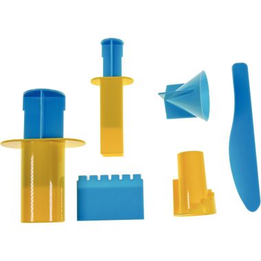Set de 5 moules et un couteau pour château. Ensemble de moules pour reproduire les tours et les remparts des châteaux. 6 accessoires toure ronde (3,5 cm de diamètre 6,5 cm de haut), colonnes carrées (1,6 cm x 1,6 cm et 6,5 de haut), murs (6 de large x 4 cm de haut), des marches de la tour, cône, couteau en plastique (14 cm de long).