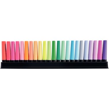 La palette complète de 23 couleurs. Ensemble en plastique et emballage carton 100% recyclé. 9 couleurs fluos et 14 couleurs pastels, Largueur de tracé : 2 à 5 mm.