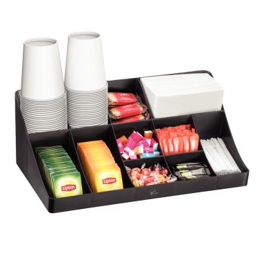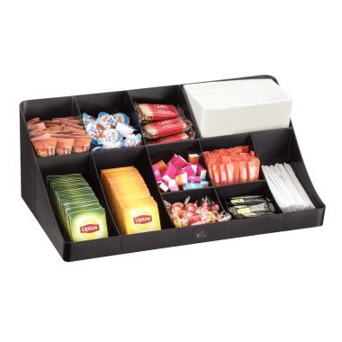 Station de rangement 11 compartiments noire. Station de rangement 11 compartiments pour accessoires : gobelets, cuillères, serviettes, sucres, sachets de thé. Polystyrène antichoc