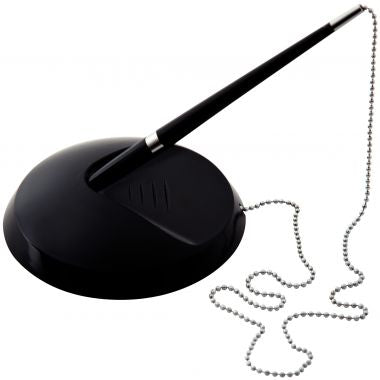 Stylo bille sur socle noir. Ecriture moyenne, pointe 1mm. Avec chaîne. Livré avec 2 recharges additionnelles en noir.